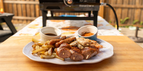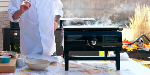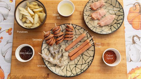 Chef Murray Zehr: The BakerStone Portable Griddle is a great way to put out a fast & tasty meal on Halloween Night while trying to get the kids in their costumes. Not only that, but everything also tastes better on a stick! I use 4 oz. of meat or protein per person.