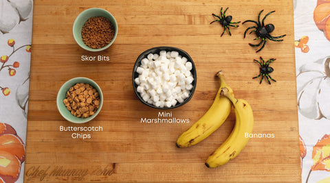 Step 2: Open the bananas and stuff them with the marshmallows, Skor bits, and butterscotch chips.
