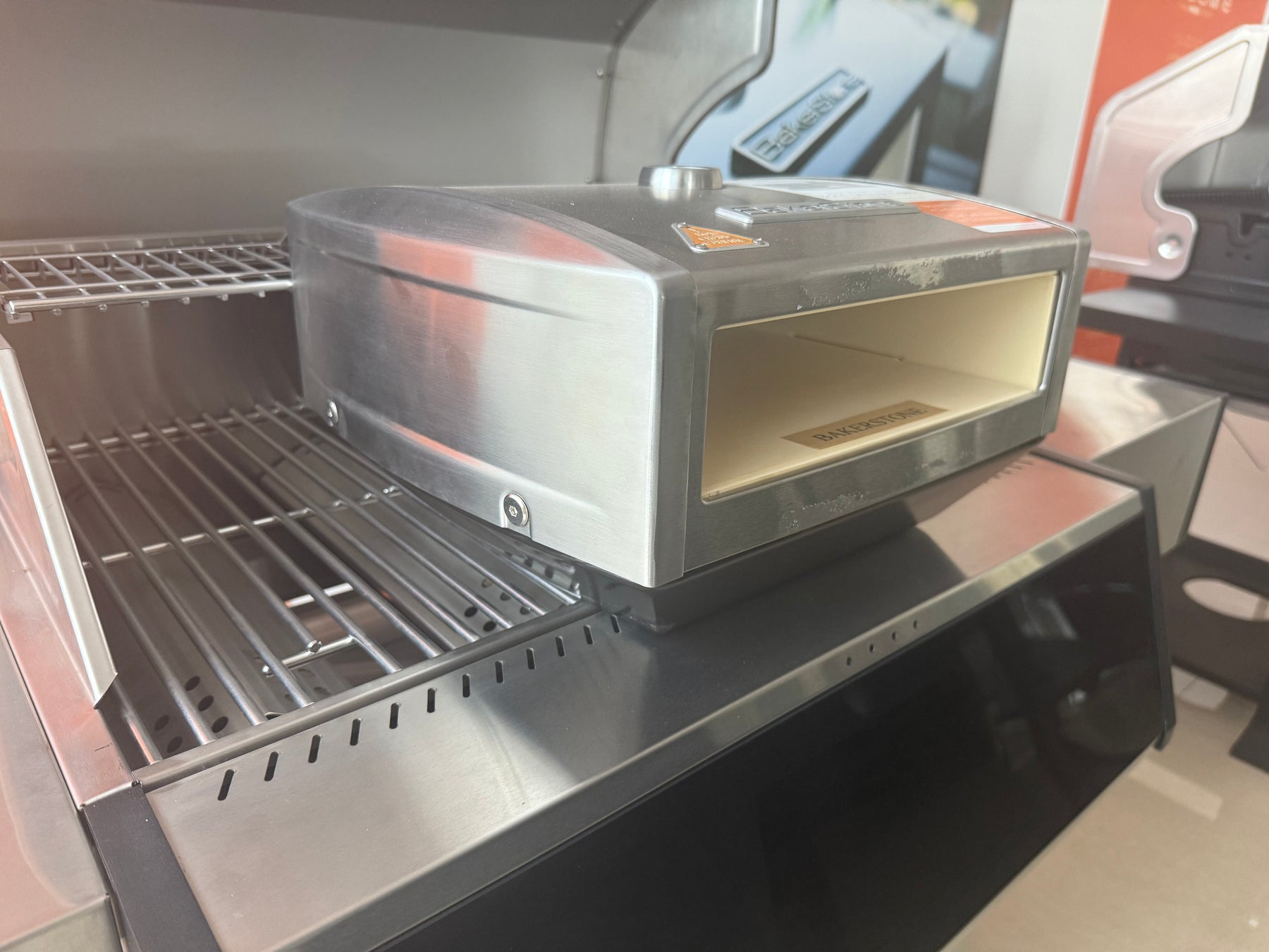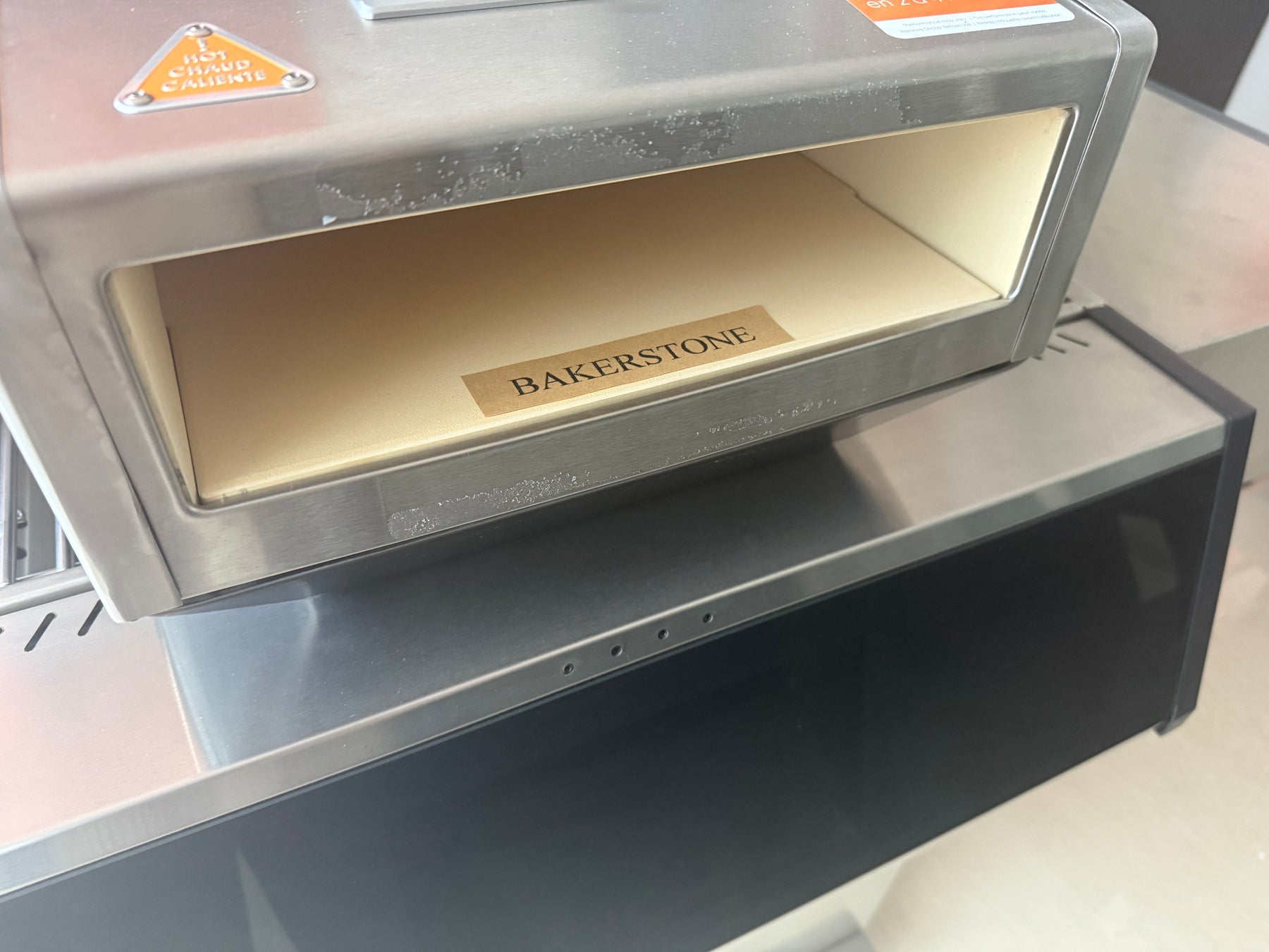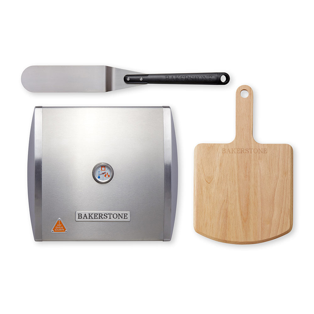 The BakerStone Basic Series pizza oven box kit allows you to transform your grill into a gourmet pizza oven. The pizza oven box's patented design raises the temperature of outdoor grills to that of a real wood burning pizza oven. Unmatched baking performance is achieved by combining convective, conductive and radiant heat to quickly and evenly bake a variety of foods. Stainless steel baking chamber. Converts most 2-burner and larger gas grills into a gourmet pizza oven.
